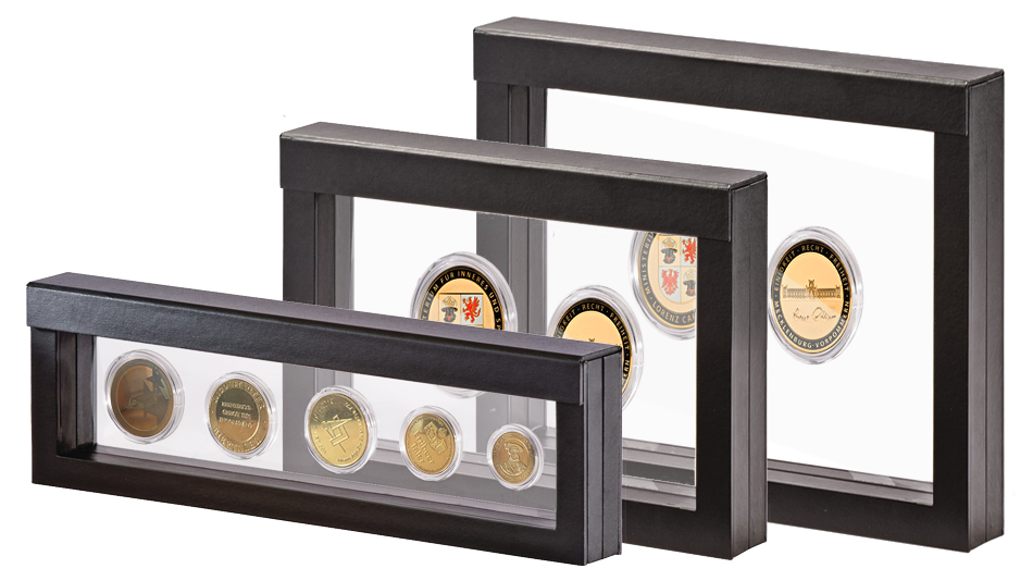 Die Münze schwebt im Rahmen, ist von beiden Seiten sichtbar, und der Rahmen lässt sich leicht öffnen