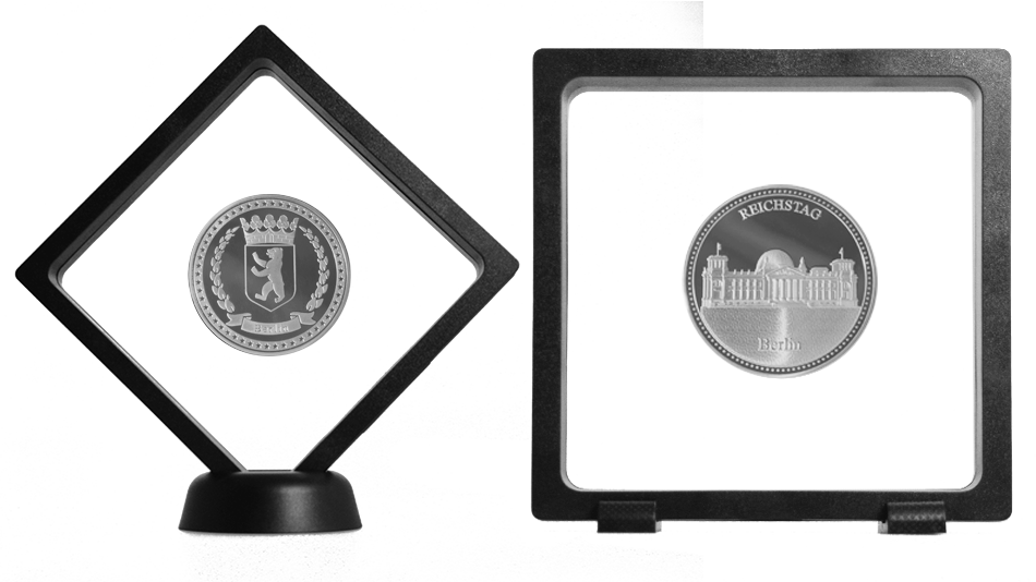 Die Wahl der Mehrheit unserer Kunden? Unser Rahmen V19: Die Münze scheint zu schweben und ist von beiden Seiten sichtbar.